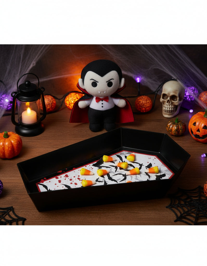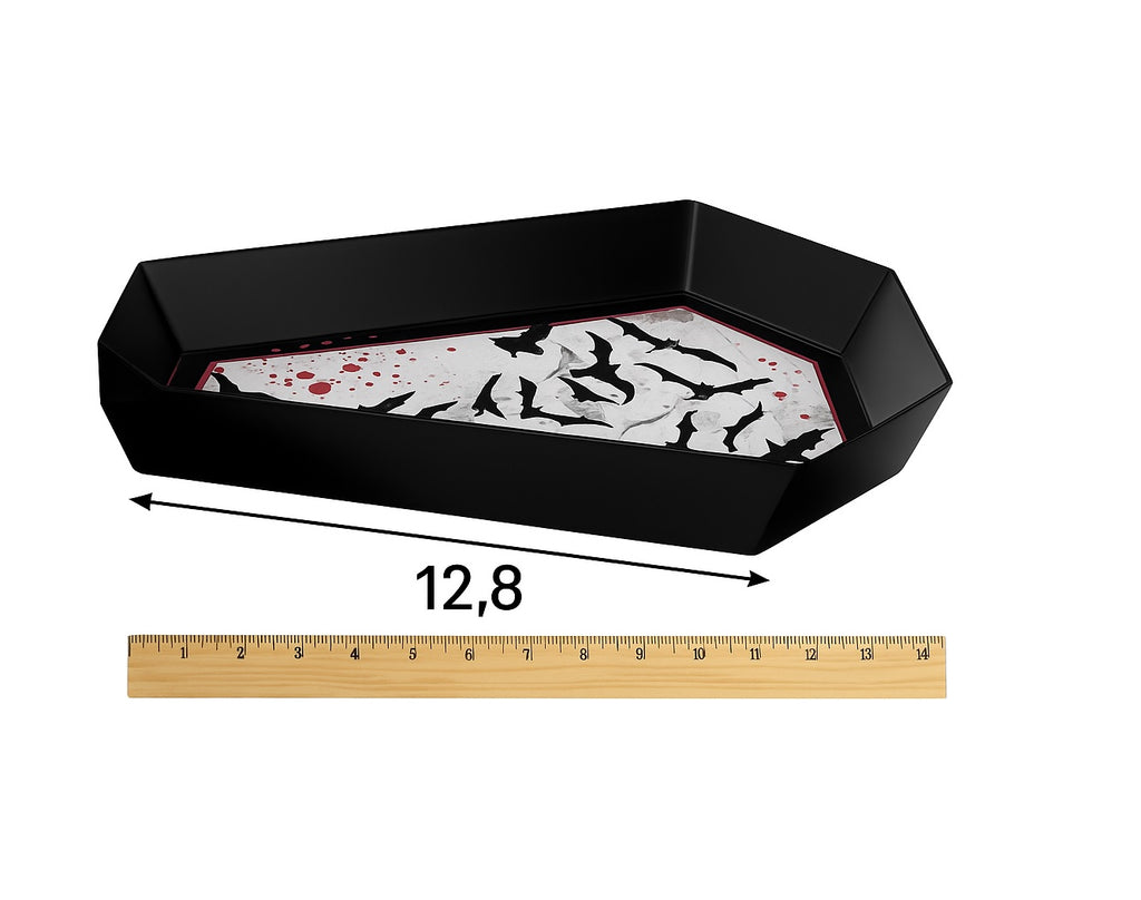 Turn your Halloween celebration into a spine-chilling spectacle with the Dark Manor Coffin Shaped Melamine Bowl. Crafted from durable, reusable melamine, this eerie black serving dish features a sinister coffin shape with blood-red splatter accents and flying bat motifs, perfect for spooky parties, gothic décor, or horror-themed events. Measuring 12.8" x 8", it’s ideal for serving candy, snacks, party appetizers, or even creative desserts like red Jell-O “blood baths” and eyeball treats. Whether you’re hosting a haunted house, gothic dinner, or Halloween bash, this tray brings the perfect mix of creepy and classy charm.
