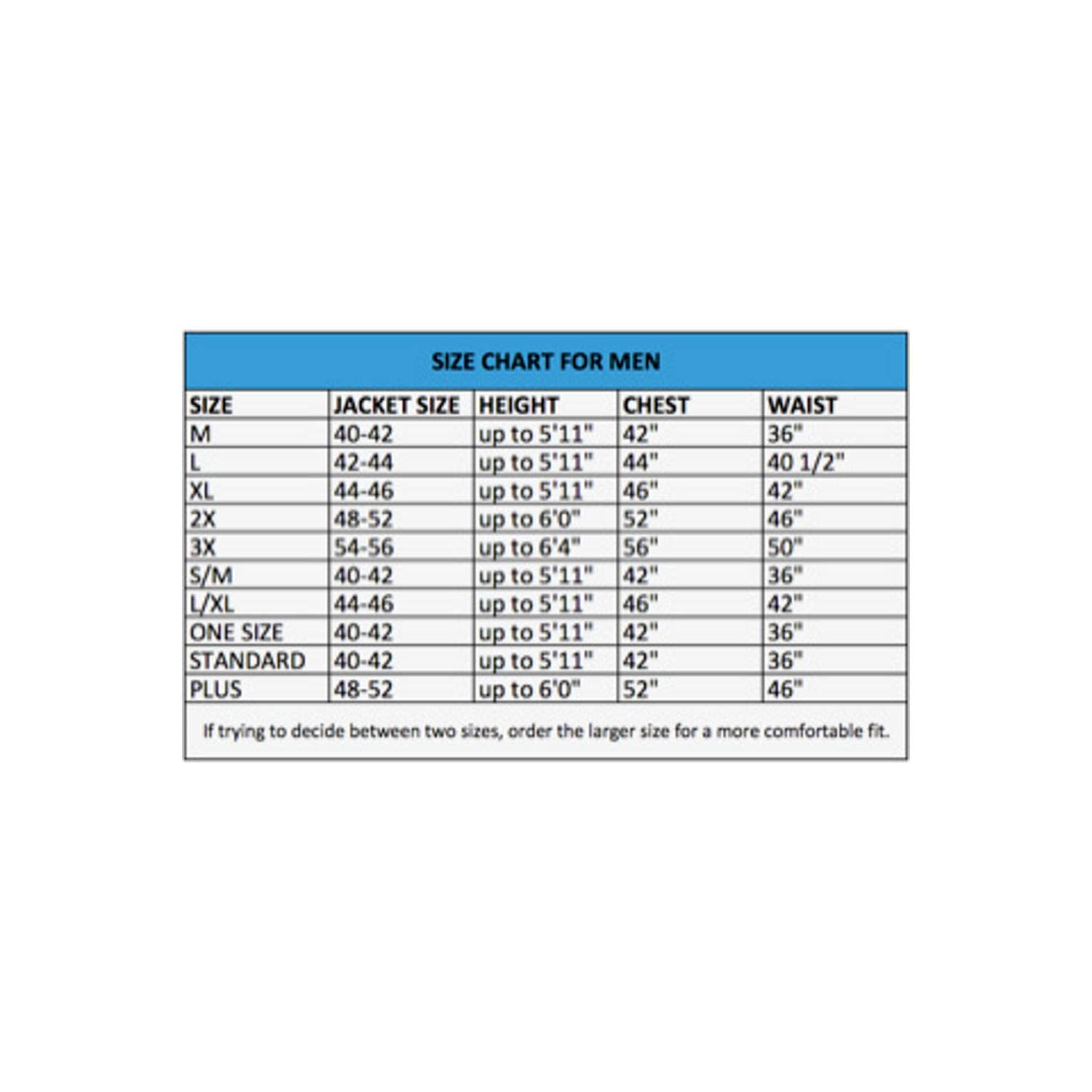 Adult Standard -40-42 Jacket Size – Up to 5’11” Height – 42” Chest – 30.5” Waist – 36” (We recommend that you always order the larger design if trying to decide between two sizes for a more comfortable fit.)
