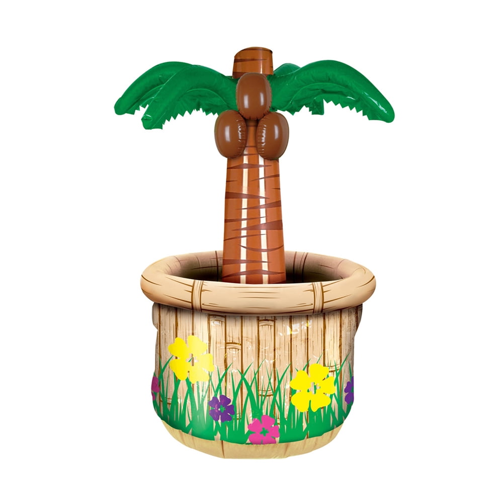Beistle 50082 Inflatable Palm Tree Cooler. This palm tree cooler can hold approximately 24 twelve ounce cans. It measures 18 inches wide by 28 inches high. The base of the cooler is printed with flowers and the center has a palm tree standing up. Put some ice and drinks in this cooler for your next luau party!.