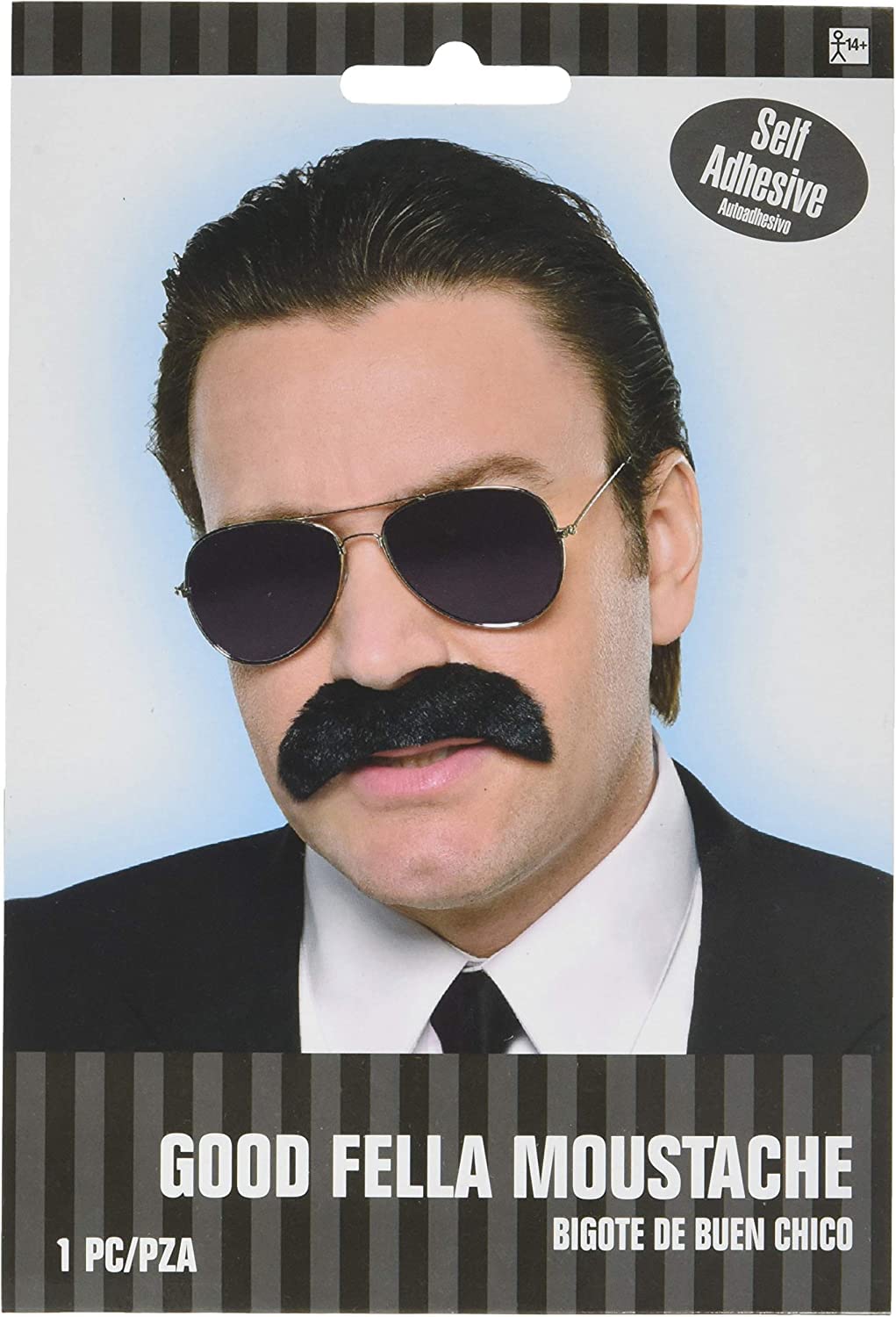 Any other moustache would be a crime! Put the "enforcer" touch on your wise guy look with our Good Fella Moustache, a thick black chevron of synthetic hair that sticks to your lip like the FBI tail on your car. Self-adhesive and easy to apply, this Good Fella Moustache also works as a spur of the moment disguise, and can be used as much as you like when you travel from city to city on family business. An offer you can't refuse!