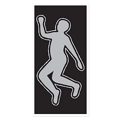 This body silhouette decoration features a silver body with white body outline on a black background. Printed on plastic and is great for indoor or outdoor use. It is an excellent decoration for as PSI Crime Scene Party to use on the floor or on a door, the choice is up to you! This item measures 30 Inches by 60 Inches and would be a fantastic addition to any Murder Mystery party!