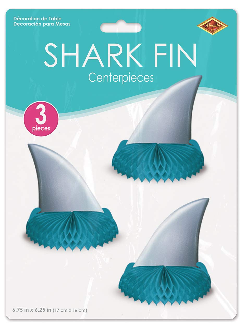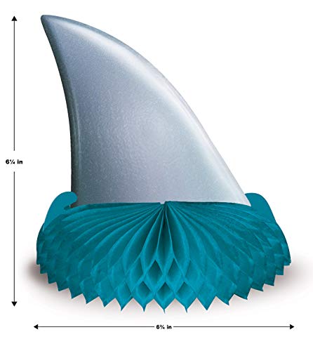 This package contains 3 Shark Fin Birthday Table Centerpieces. Each shark centerpiece measures 6.75 inches tall by 6.25 inches wide. They are made of durable cardstock paper and tissue paper. They make cute centerpiece decorations for a shark theme birthday party.