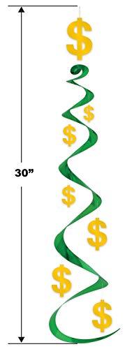 Beistle 50064 "Dollar" Whirls (3 Count). These whirls have green metallic spirals with randomly attached gold dollar sign icons. The whirls are 30 Inch long. Hang these whirls up for a casino themed party!.