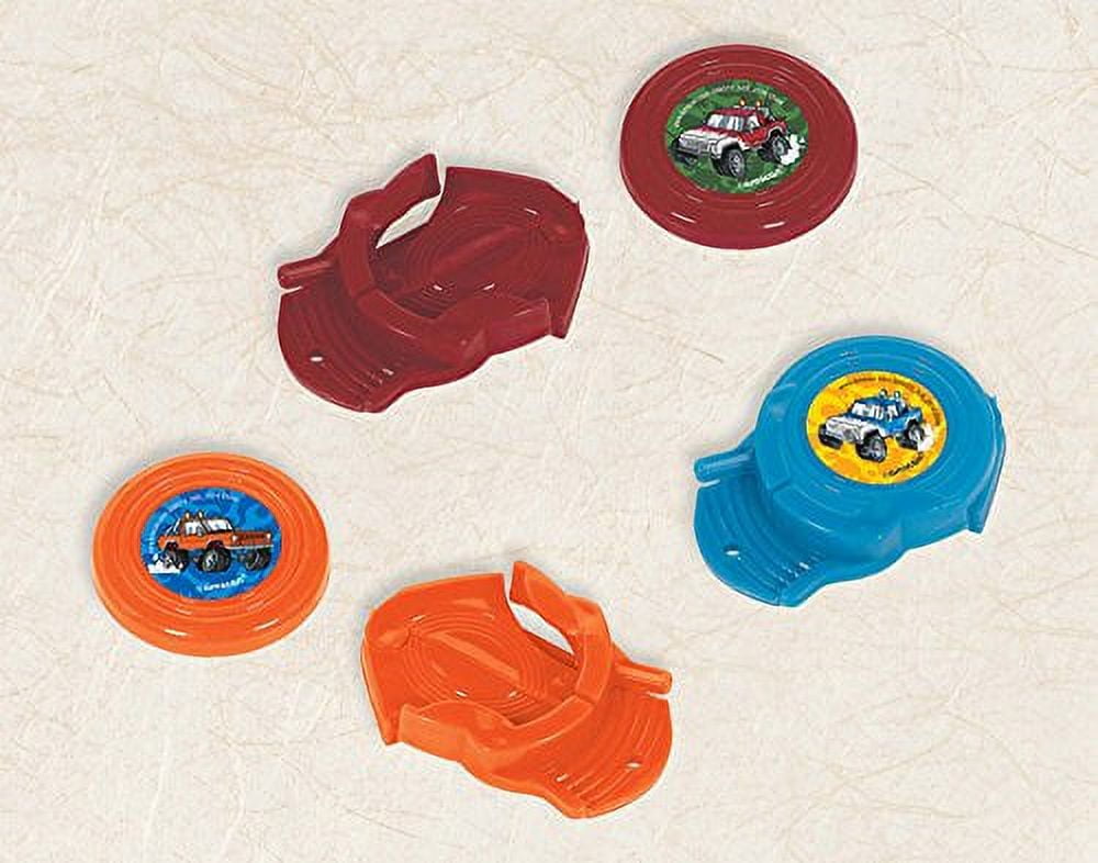 Our monster Truck disc shooter to your favor bags! Features a variety of colored monster Truck disc shooters. Measures 1. 25" X 2". Includes 1 disc shooter per package.