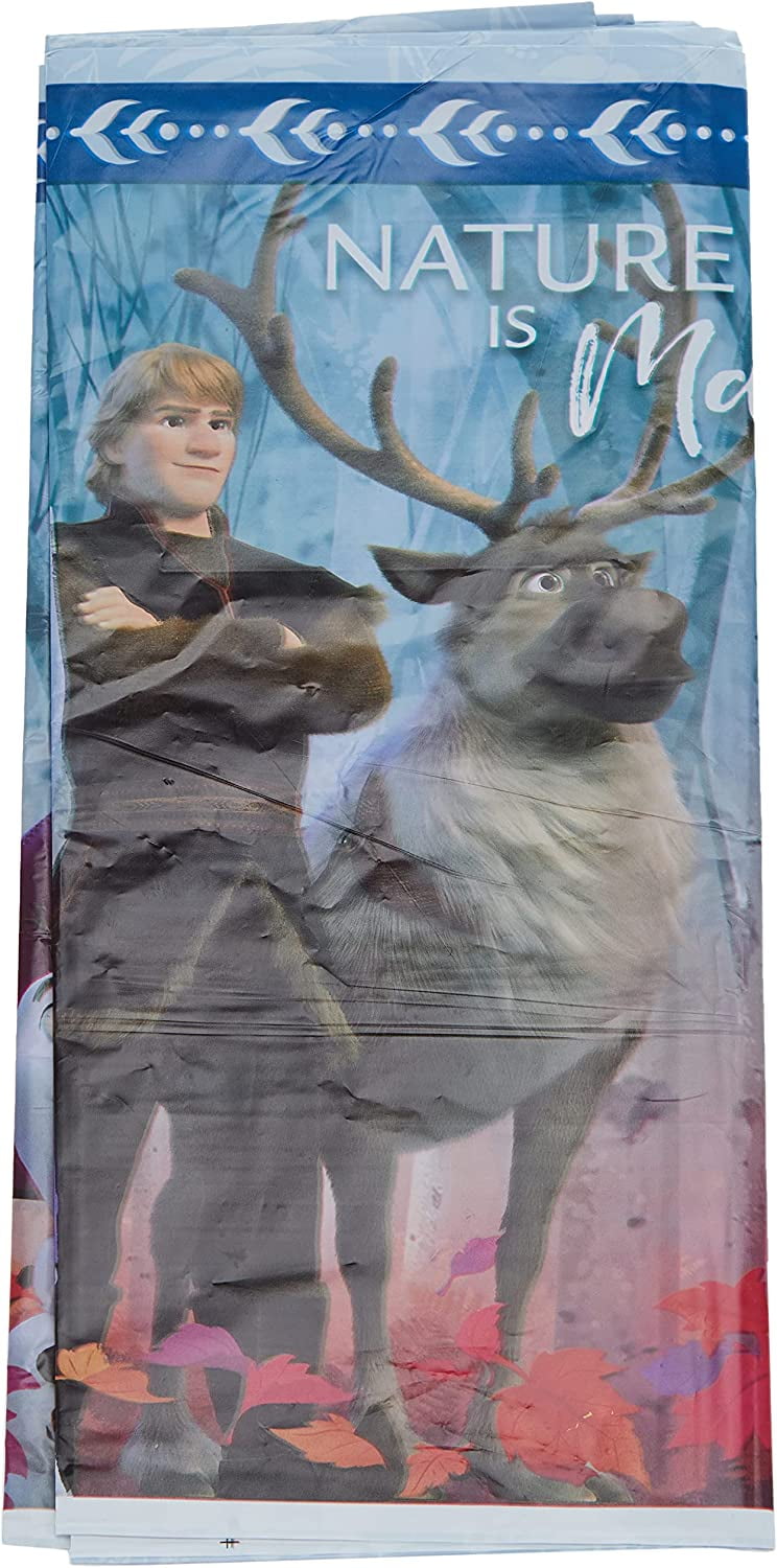 Set the table for a birthday adventure with this Frozen 2 Table Cover. Its borders are covered in a forest scene with Anna, Elsa, Kristoff, Sven and Olaf looking toward the headline "Nature Is Magical". The center of this plastic table cover is icy blue with subtle silhouettes of foliage to match the rest of your Frozen 2-themed decorations. When the party comes to an end simply toss this disposable table cover in the trash or wipe it down and store it away for your next Frozen celebration!