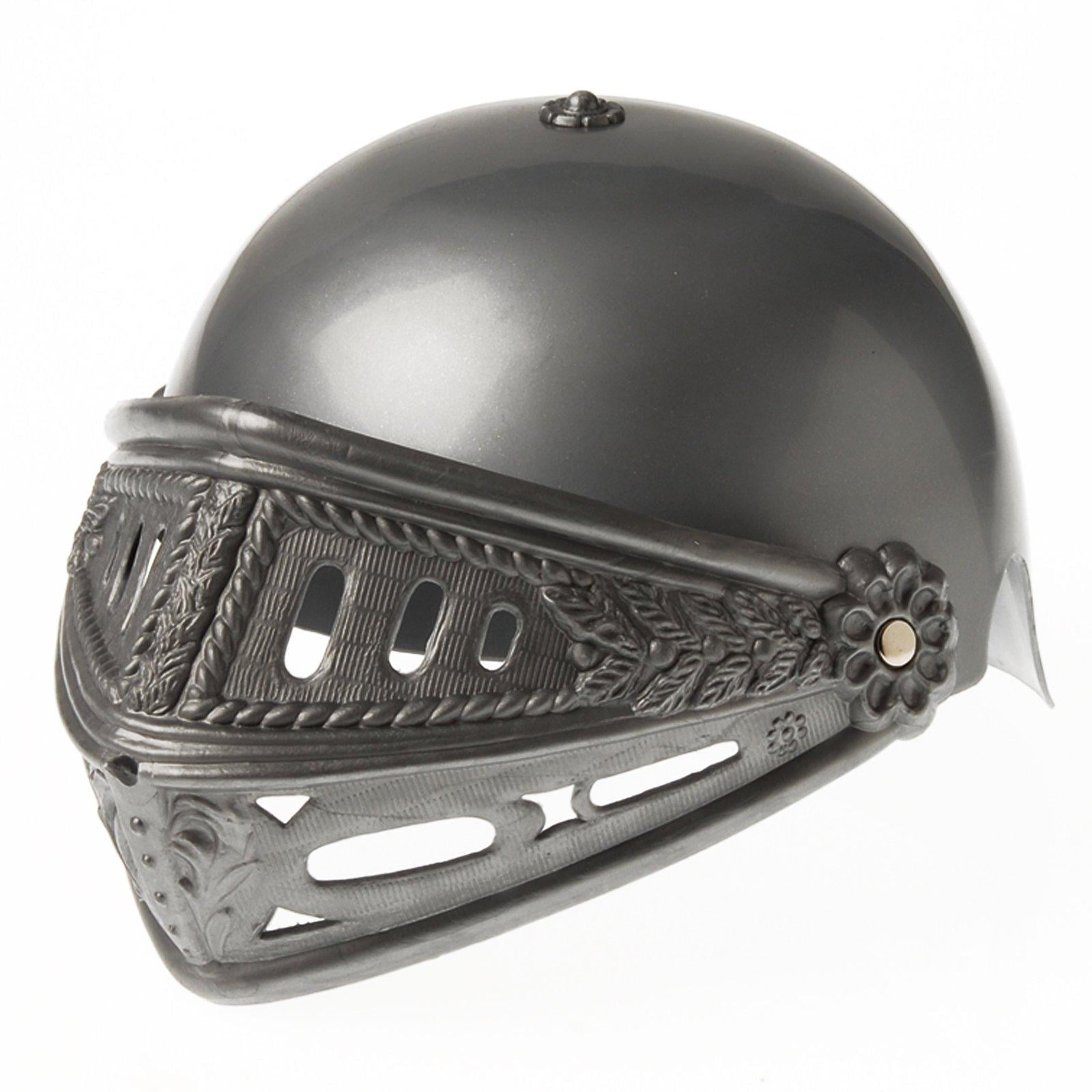 Includes (1) Knight Helmet (child sized). Plastic; 10.5" W. Toy plastic silver knight helmet with movable visor / eye shield. Made of hard plastic. Ideal for a Halloween costume or dress up.
