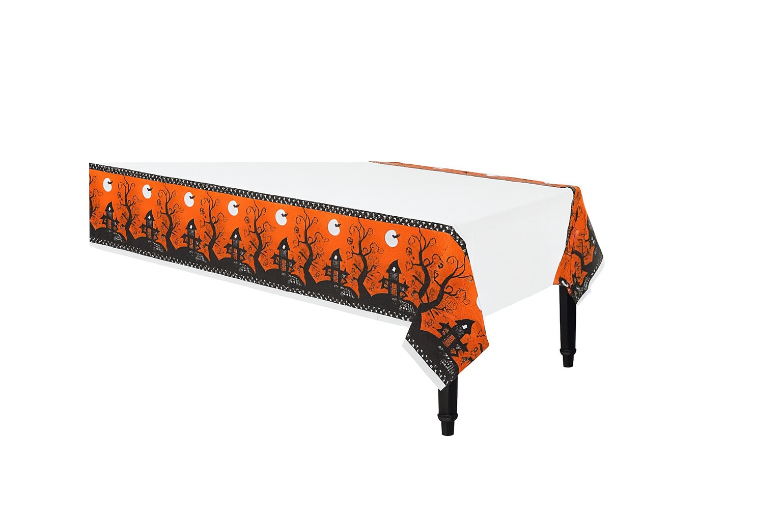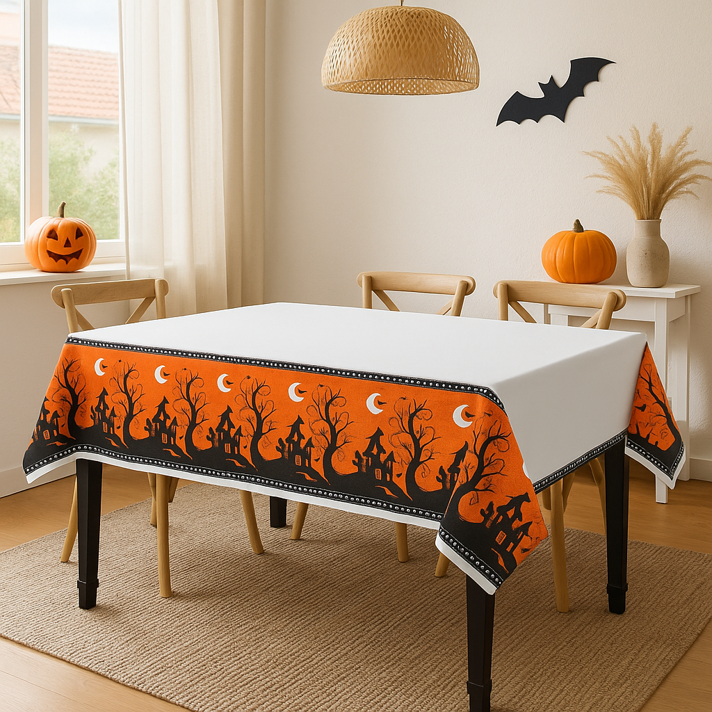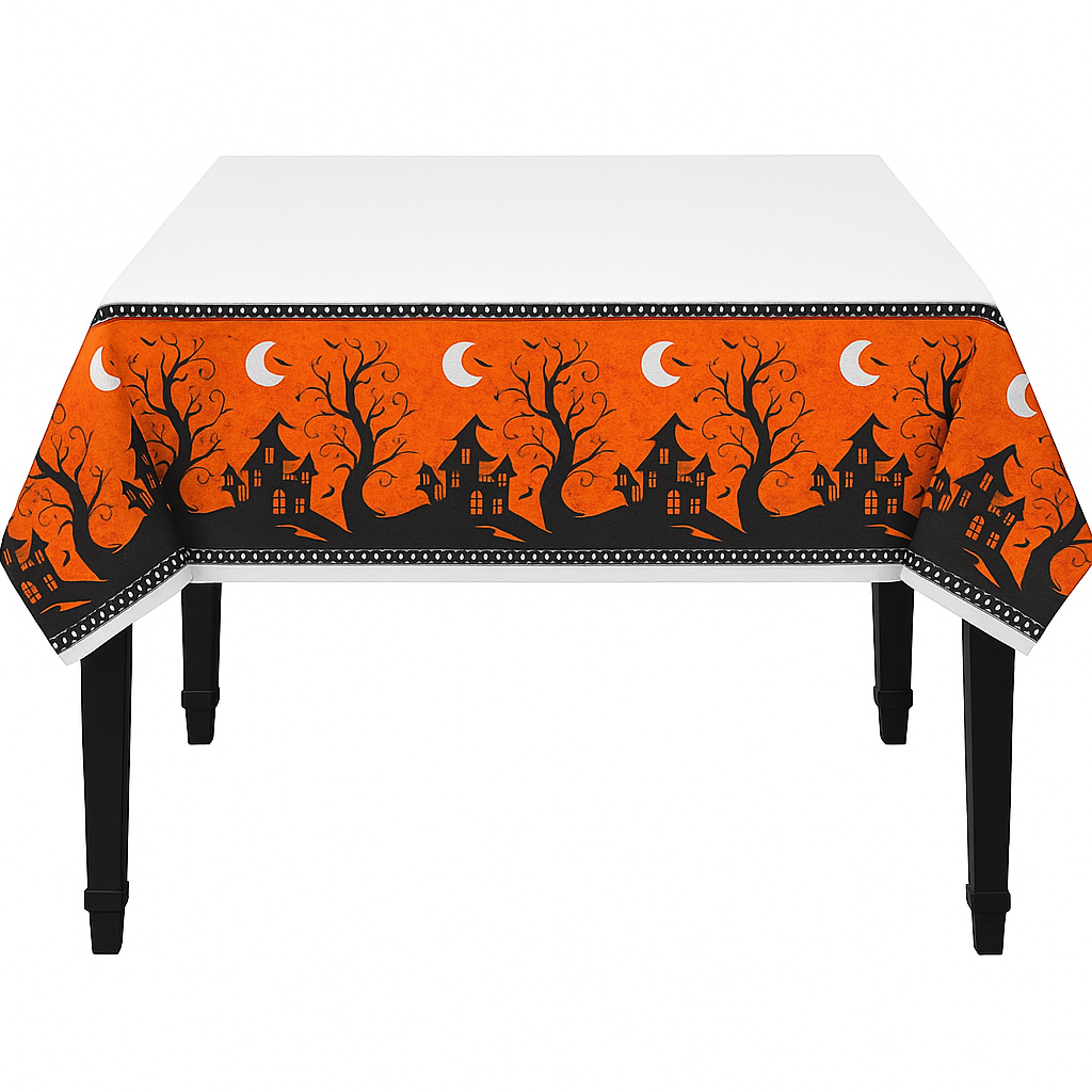 The eye-catching Halloween design features bright orange borders with haunted houses, eerie trees, bats, and crescent moons that set a spooky yet fun atmosphere for guests of all ages. Whether you’re hosting a children’s Halloween party, decorating for a haunted house, or setting up a classroom celebration, this table cover makes decorating fast and cleanup effortless.