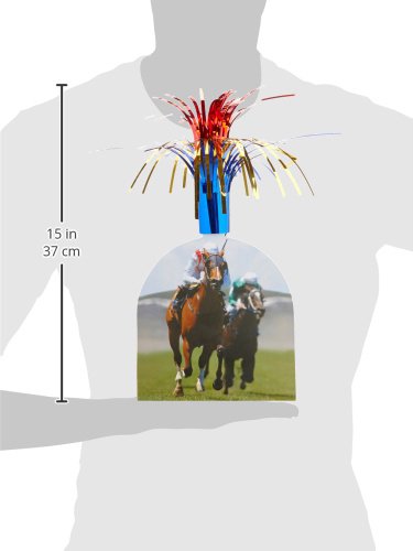 Beistle 57754 Horse Racing Centerpiece. This is the perfect centerpiece to use for a derby day party! The base is printed on board stock with a horse racing image and it has a cascade-like top. This centerpiece is 13 Inch tall.