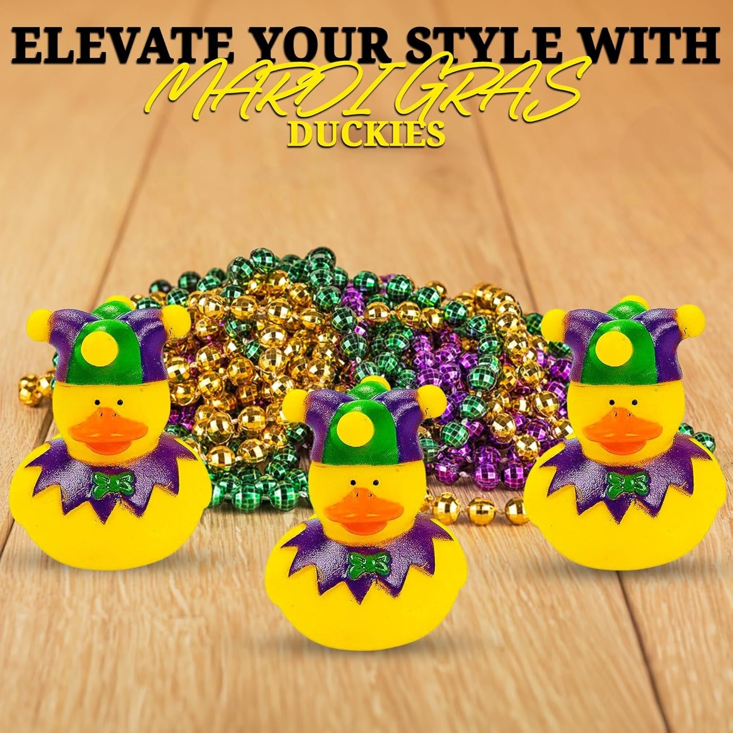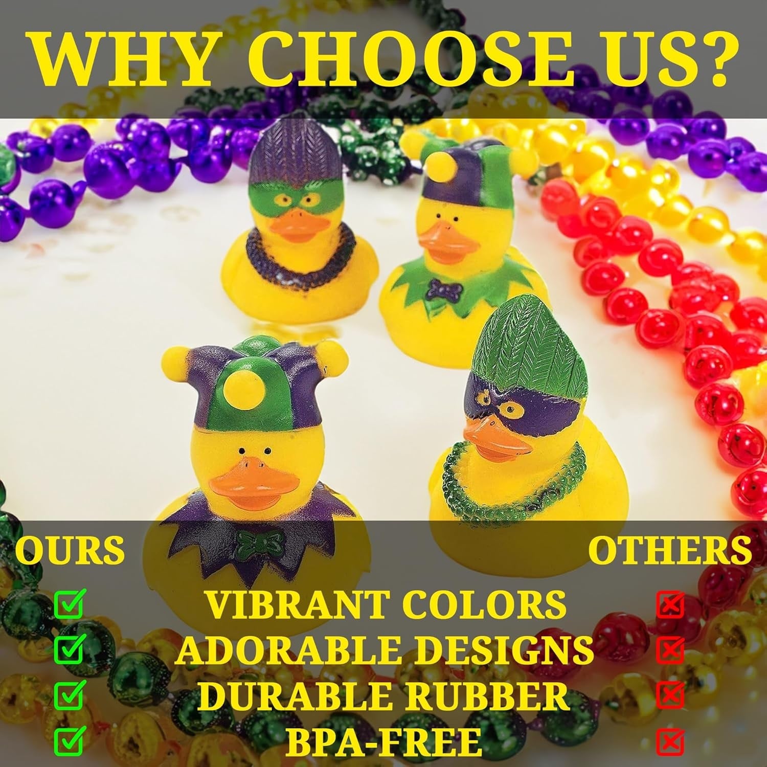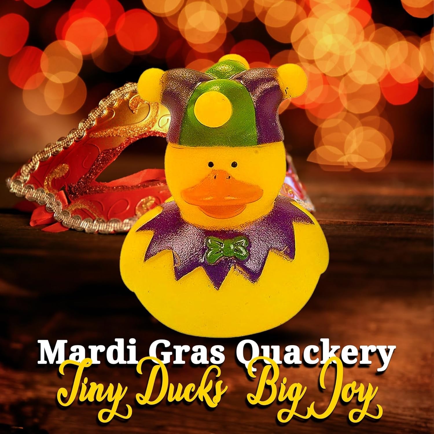 Bring Mardi Gras energy to your party, parade, or goody bags with this festive set of 12 Mardi Gras rubber ducks, each a charming 2 inch size. Styled in classic purple, green, and gold, these duckies feature playful details like masquerade masks, jester hats, and bead necklaces inspired by New Orleans celebration vibes.