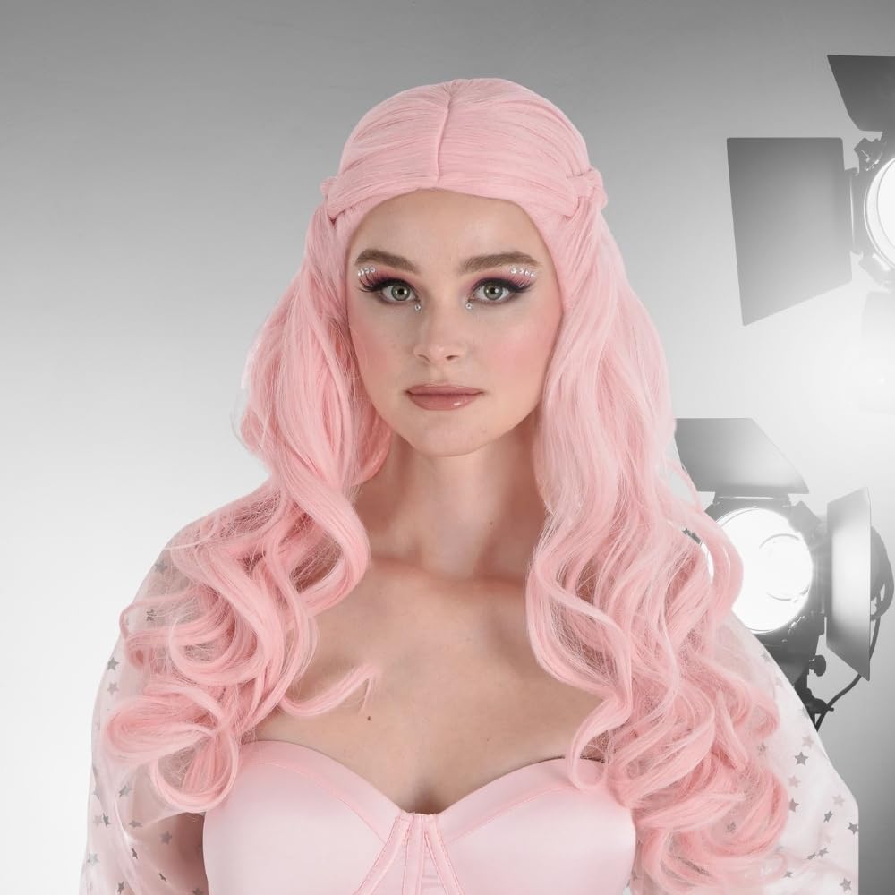 You're the prettiest princess ever in this dramatic long wig. With big open curls that fall all the way to your mid back, this bubblegum pink wig has a center part, with the front pieces braided back on each side and joined with a matching pink bow. It also includes an adjustable wig cap and is made to be styled with hair spray and cool hair tools.