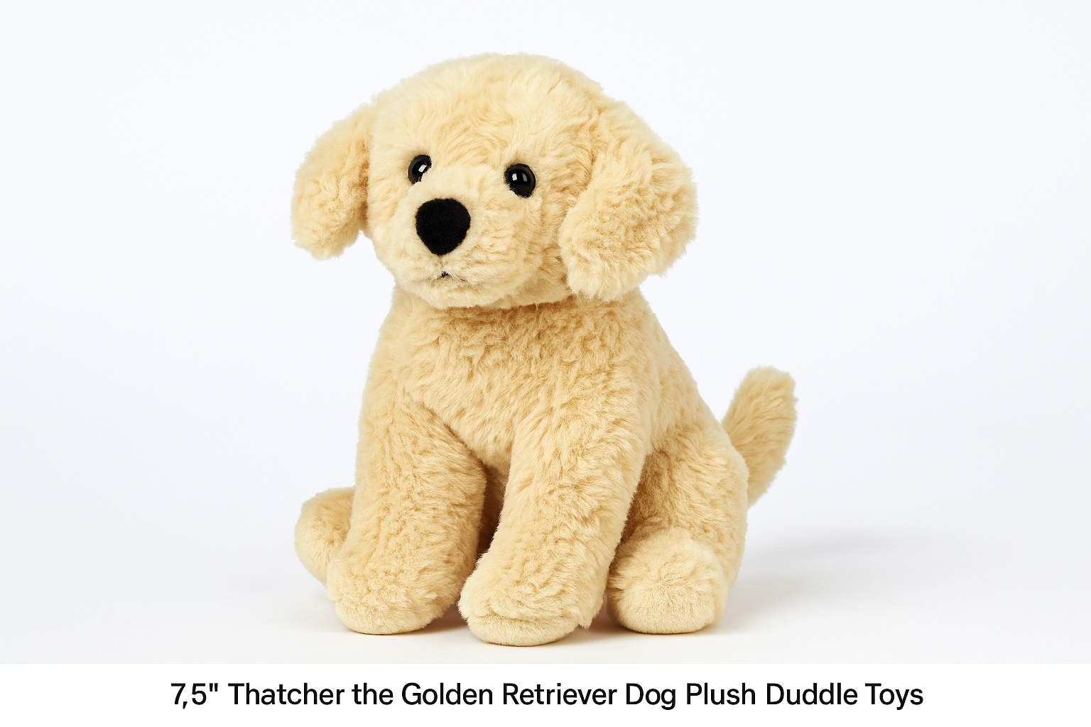Thatcher the Golden Retriever Dog is ready for adventures and extra snuggles. Thatcher is a 7.5" golden retriever dog who loves make-believe adventures, cozy naps, and big hugs. Breed highlights: golden, feathery coat with floppy ears. With an irresistibly soft coat and an expressive face, Thatcher quickly becomes a constant companion for story time, car rides, and quiet moments.
